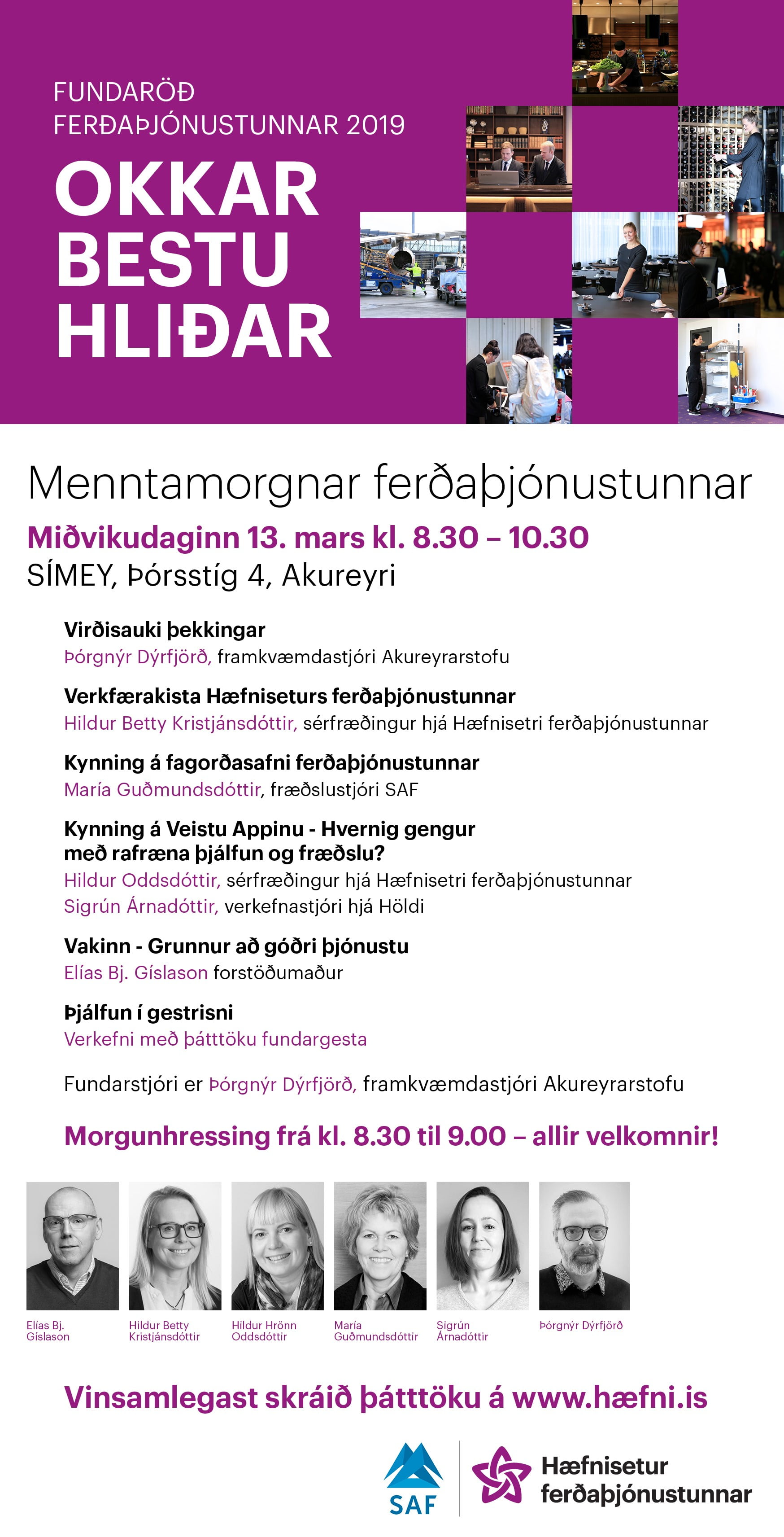 [:IS] FUNDARÖÐ ferðaþjónustunnar 2019 OKKAR BESTU HLIÐAR Menntamorgnar ferðaþjónustunnar Miðvikudaginn 13. mars kl. 8.30 – 10.30 SÍMEY, Þórsstíg 4, Akureyri Virðisauki þekkingar Þórgnýr Dýrfjörð, …